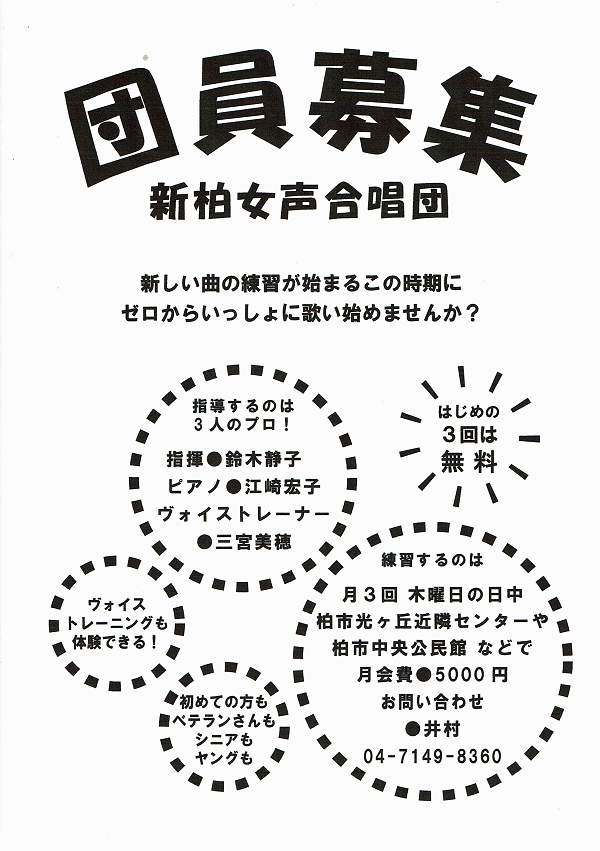 | 2025年6月7日の演奏会には、たくさんのご来場をありがとうございました。 今日はその中から2曲、与謝野晶子の原文と超訳された現代詩が1曲の中に異なる楽曲のように 連なる「みだれ髪」、ちびまる子ちゃんのほのぼのとした優しさに包まれる「きもち」を歌います。 只今、団員募集中!無料見学会3回できます。どうぞお気軽にご連絡ください。 連絡先:井村 春枝 04‐7149‐8360 |
